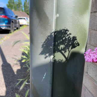Stopping to see what was happening we could see that curved shape of the lamp post that the shadow was cast, abd the angle of projection, caused the shadow shape to distort - widening the form to apear as quite a differt shape to how we perceive the flower head to be.